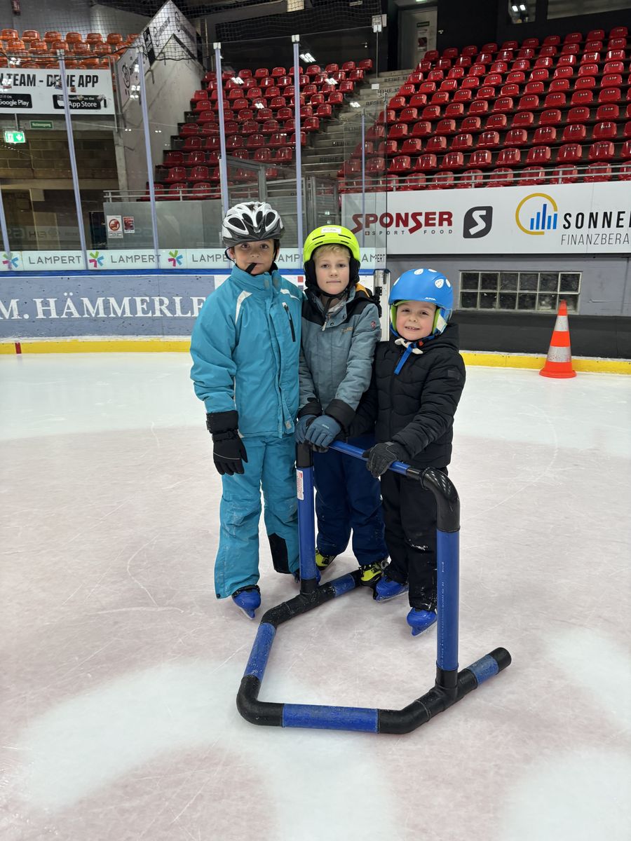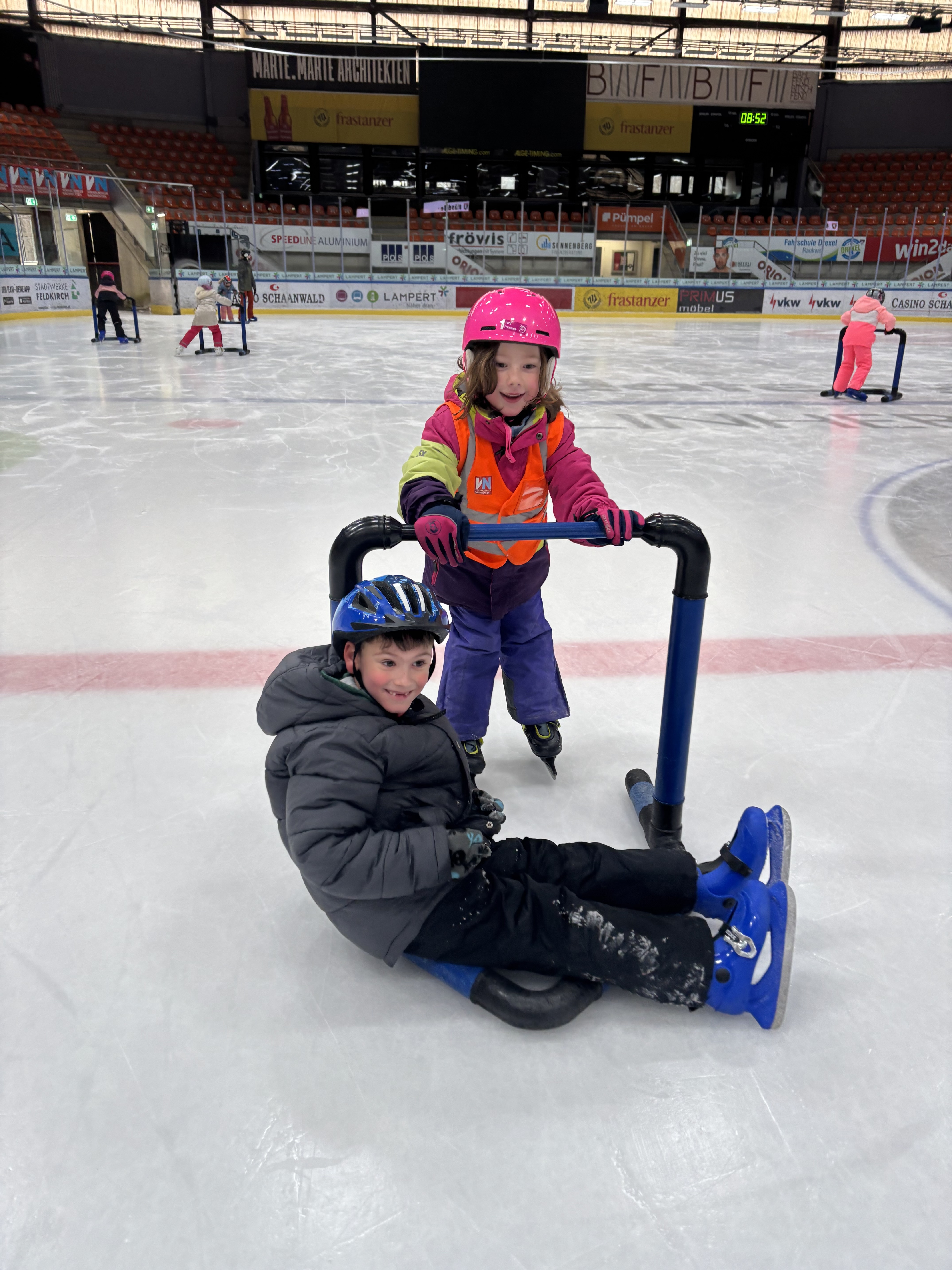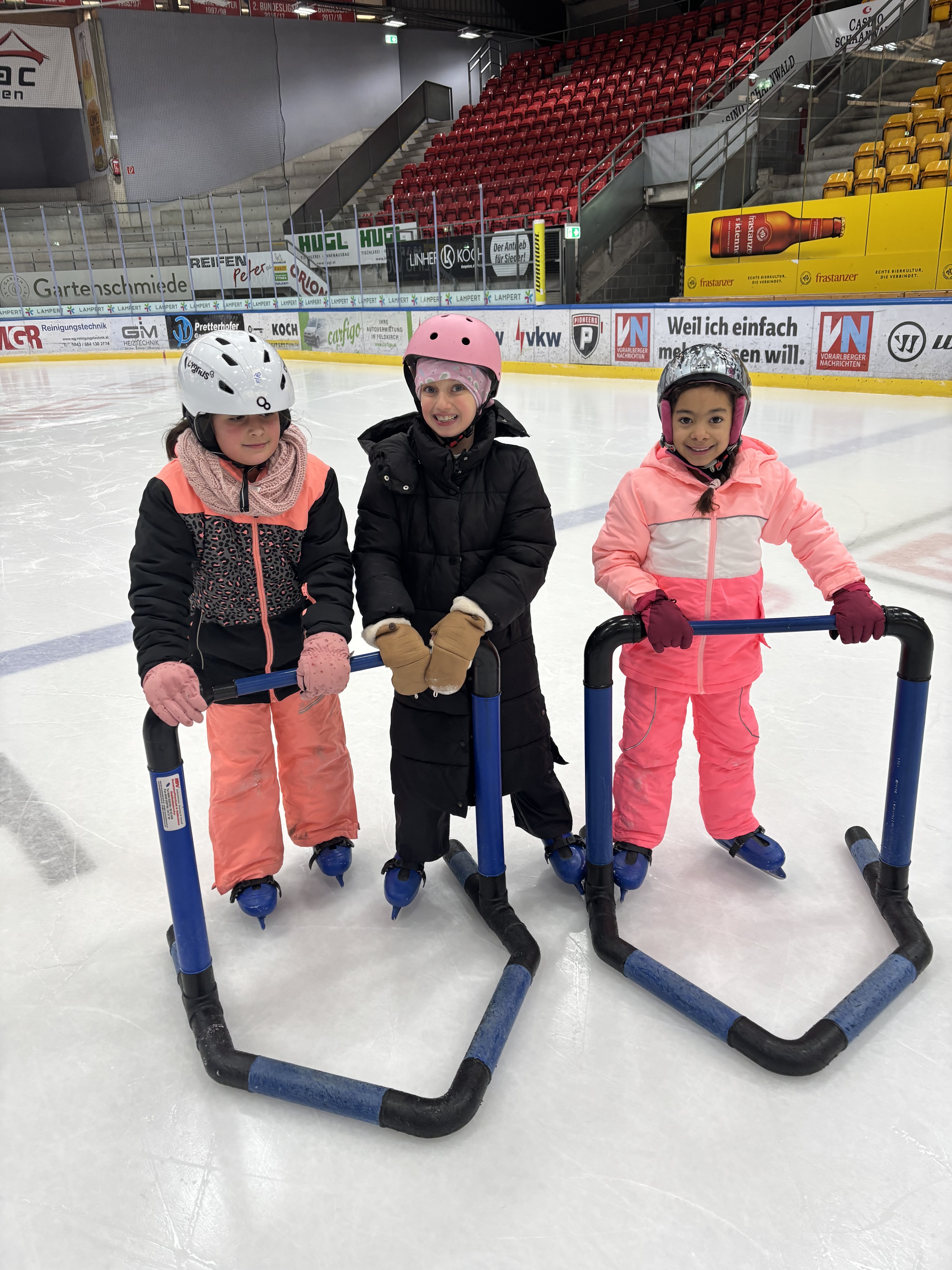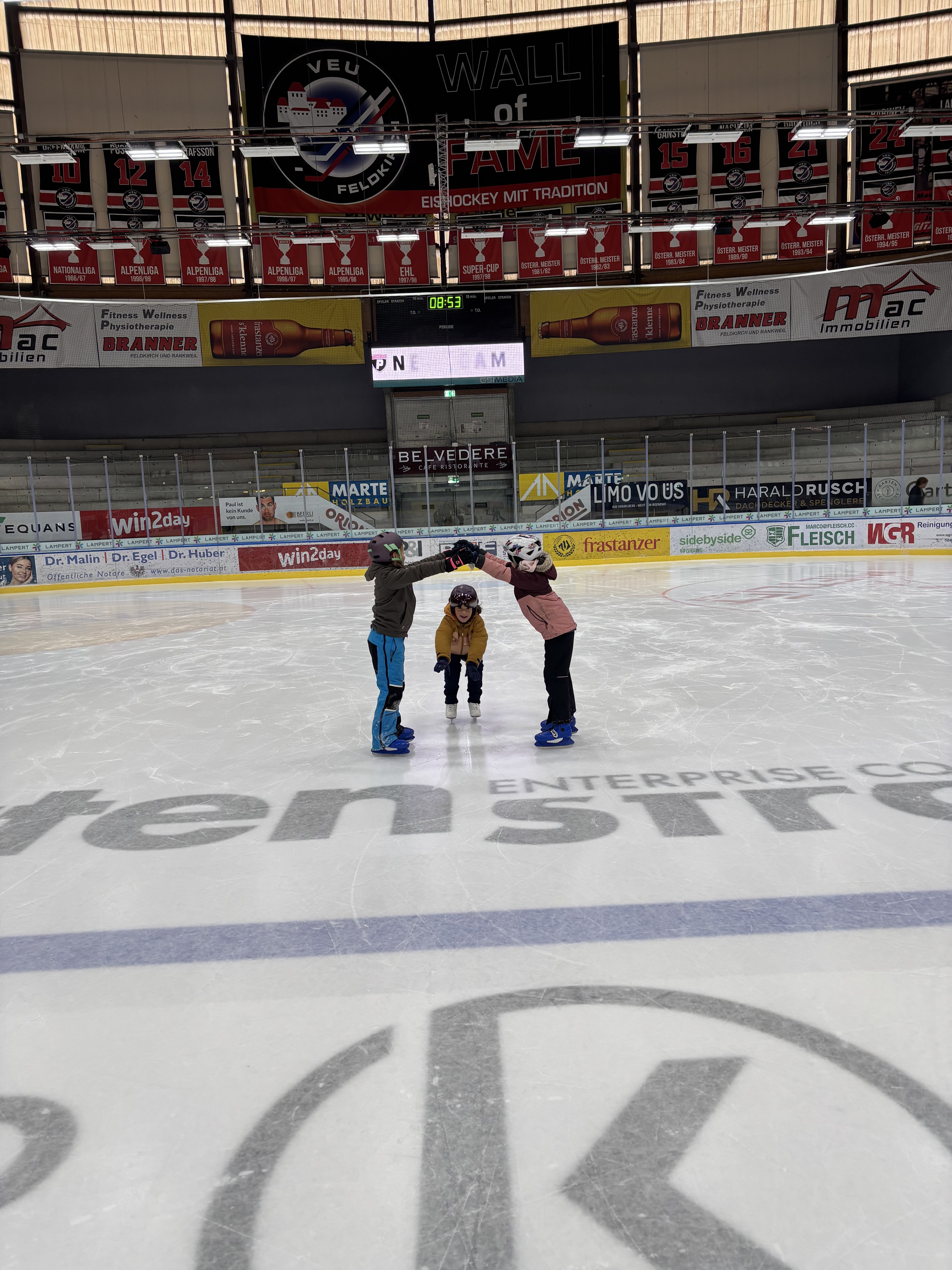 Die GTK1b der Praxisvolksschule war am 03.12.2025 beim Eislaufen in der Vorarlberghalle. Wir hatten die ganze Eislaufhalle für unsere Klasse. Leider sind wir oft hingefallen, aber Übung mach den Meister! Das Eis war rutschig und sehr kalt. Wir sind Slalom gefahren. Am Ende haben wir ein Foto gemacht. Wir sind mit dem Bus hin und her gefahren. Es hat viel Spaß gemacht!