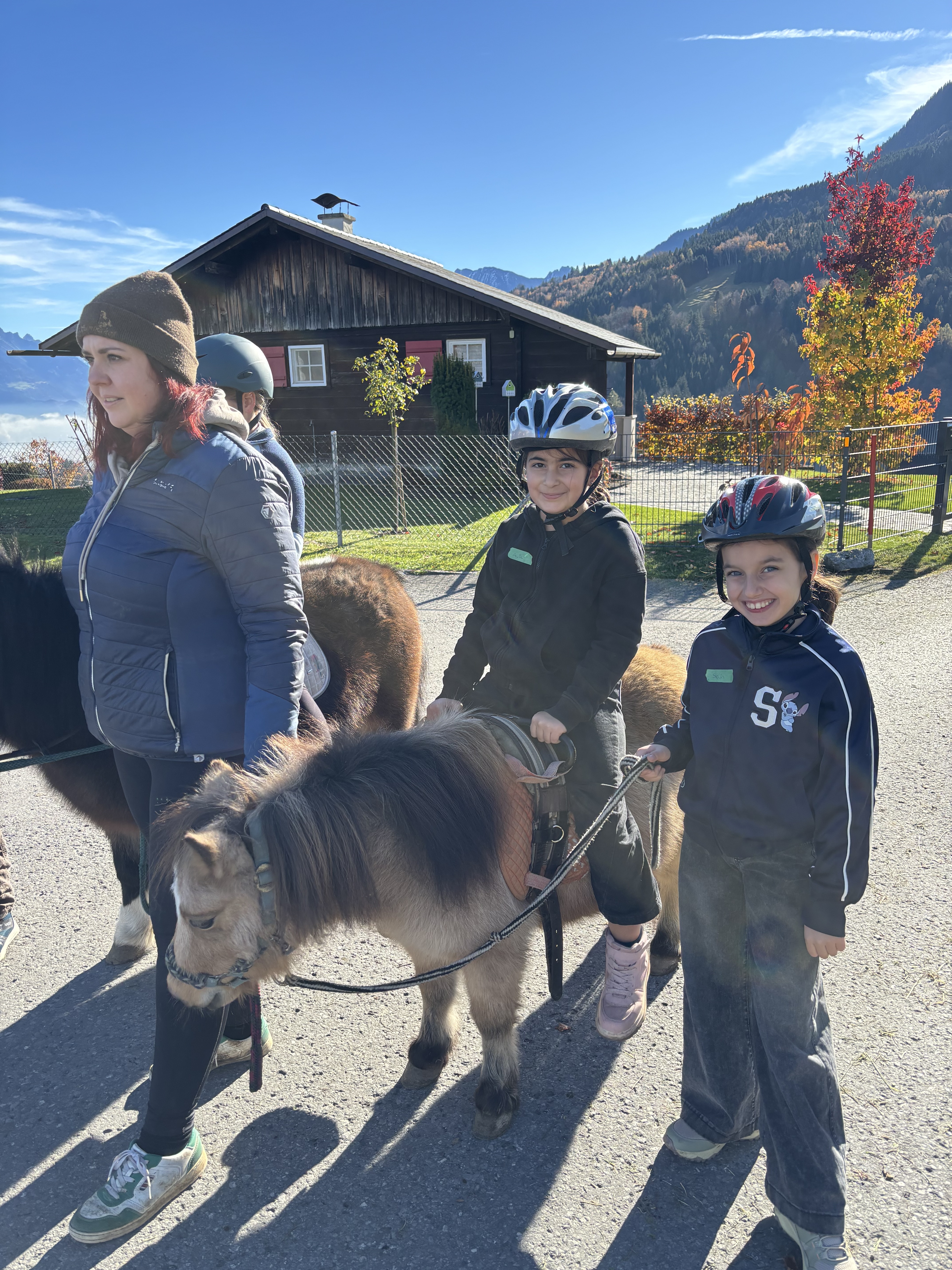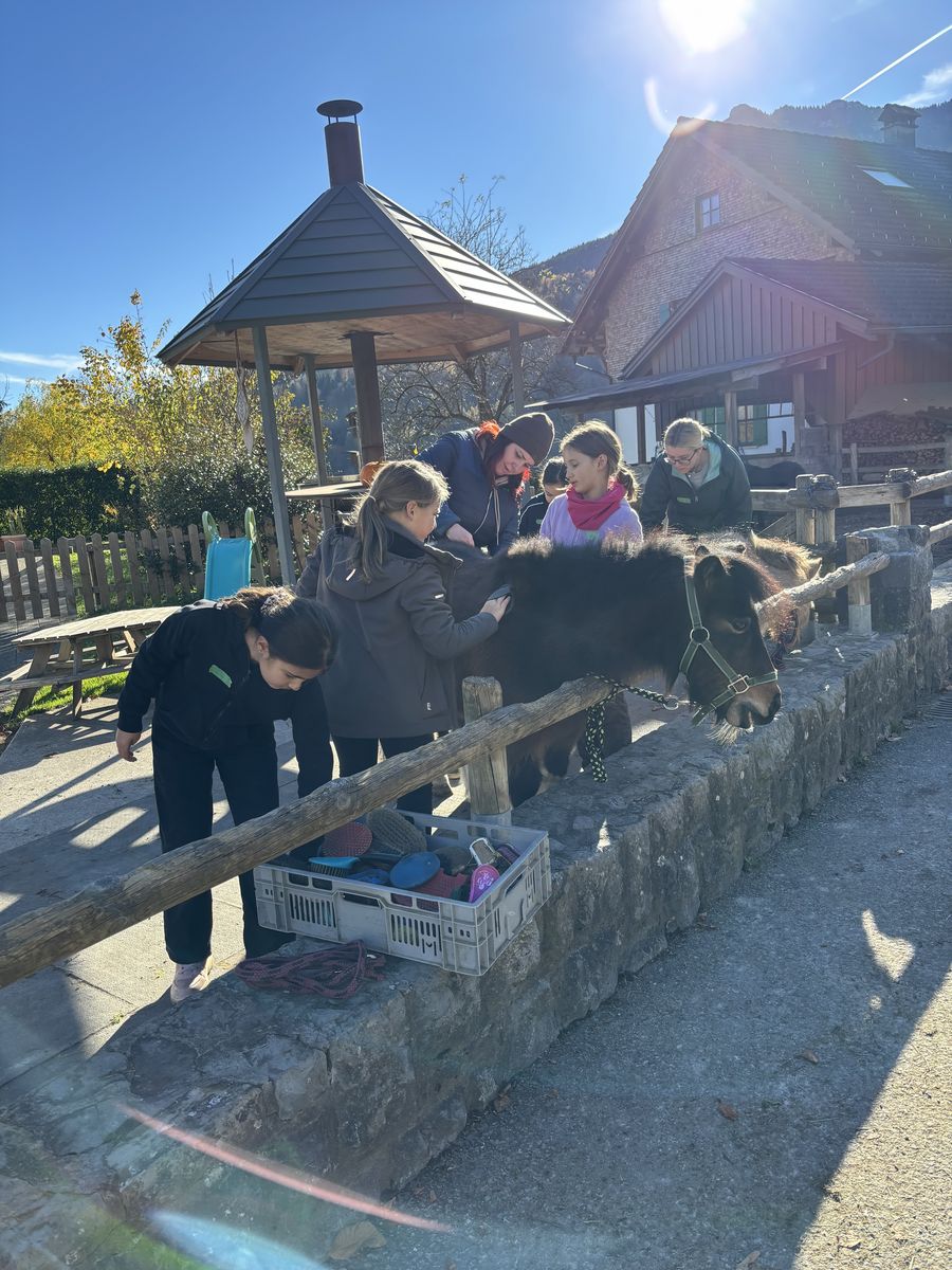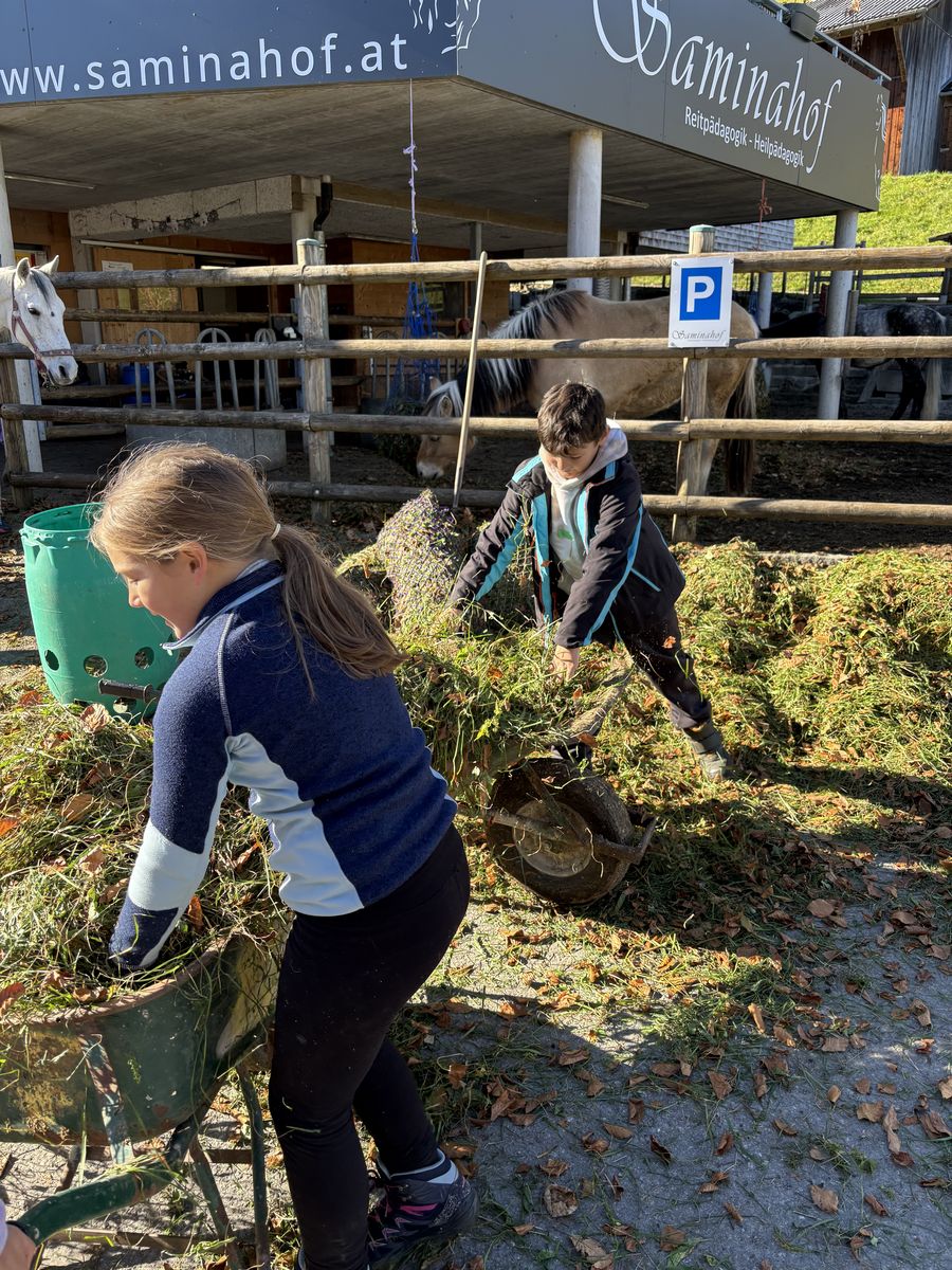 Nach dem Busfahren liefen wir vom Gemeindeamt im Frastanz nach Amerlügen. Es wahr mühsam, hoch zu kommen, aber endlich war die 1. Etappe geschafft. Später die 2. Etappe - da habne wir eine Jausen-Pause gemacht. Das letzte Stück war geschafft. Wir waren beim Saminahof. Beim Saminahof haben wir 2 Gruppen gemacht. Die erste Gruppe hat ausgemistet, die andere Gruppe war reiten. Die Reit- und Ausmistgruppe haben getauscht. Die Route beim Ausreiten war bei beiden Gruppen gleich. Am Ende hat jeder von der Reitlehrerin ein Gummibärchen gekriegt. Das Runterlaufen war so lustig.