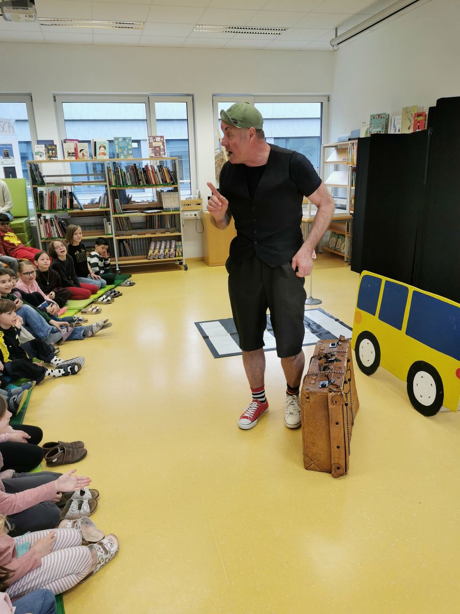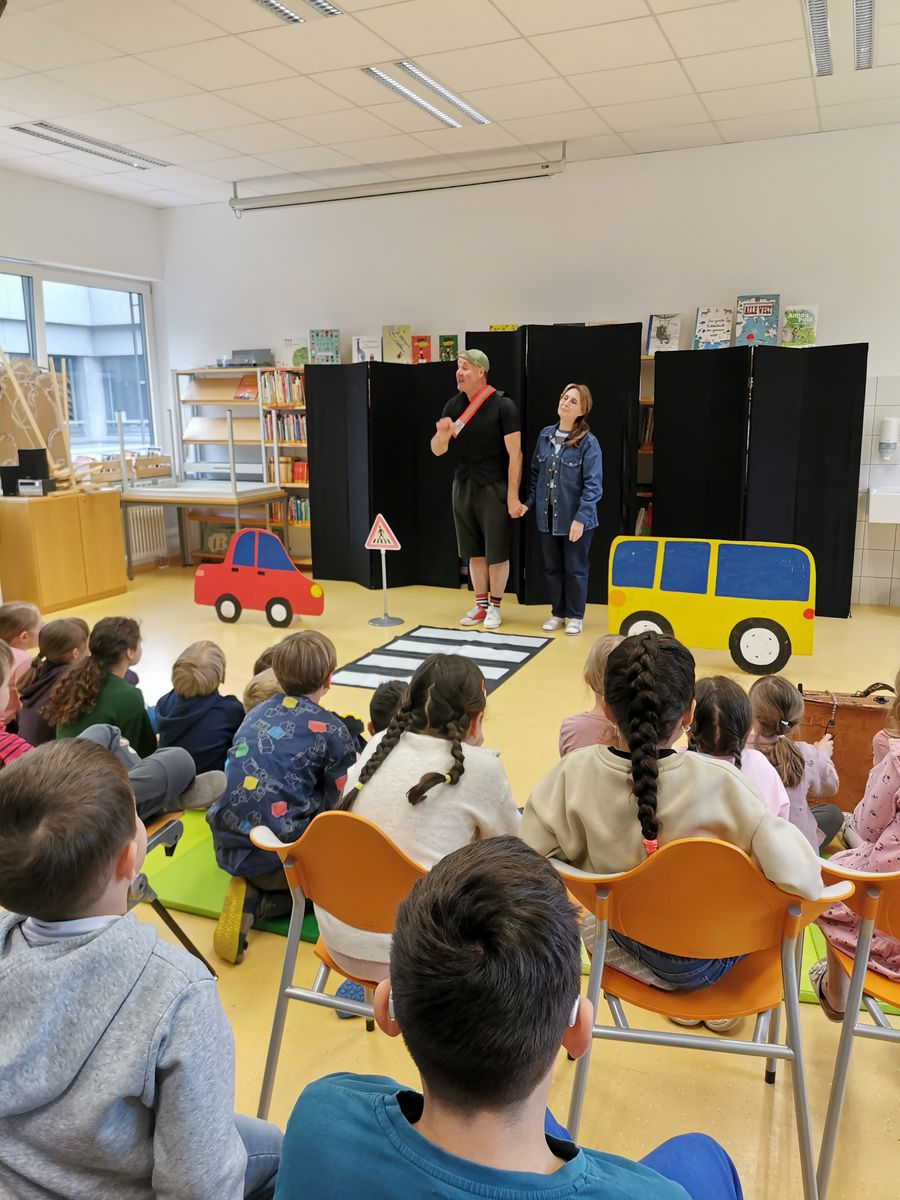 Clown Schlotterhose erklärte der GTK1 am Montag 23.3. die Regeln für einen sicheren Schulweg und gab humorvoll Anweisungen für die Sicherheit im Straßenverkehr.